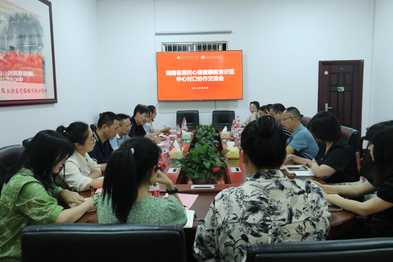 6月7日下午,长沙职业技术学院党委委员李业华一行7人到我校就湖南省高校心理健康教育示范中心对口协作项目进行研讨交流,我校党委委员、副校长邓兴国,学保处处长黄军华及相关教师参加会议。