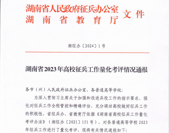近日,湖南省人民政府征兵办公室、湖南省教育厅联合印发《湖南省2023年高校征兵工作量化考评情况通报》中,我校以总成绩90.67分,获评为“优秀”等次。
