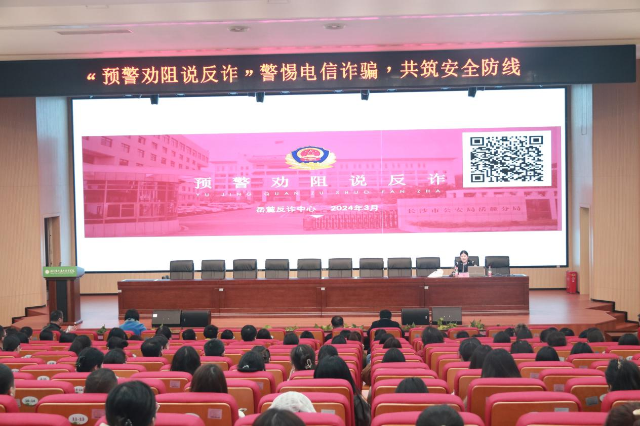 3月19日下午,我校特邀岳麓区反诈中心王紫威警官在3号实验楼报告厅开展“‘预警劝阻说反诈’警惕电信诈骗、共筑安全防线”的反诈专题讲座。全体教职员工及学生代表聆听了讲座,活动由学生工作与保卫处处长黄军华主持。