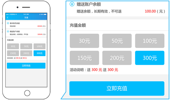 2、账户余额,点击“充值”,选择相应的金额进行充值。可在首页点击充值,也可在余额不足时在根据提示进行充值。