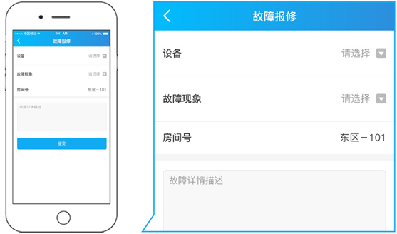 (3)点击“故障报修”,可以提交所在房间号及相应设备的故障现象,故障描述信息,方便维修人员快速维修设备;