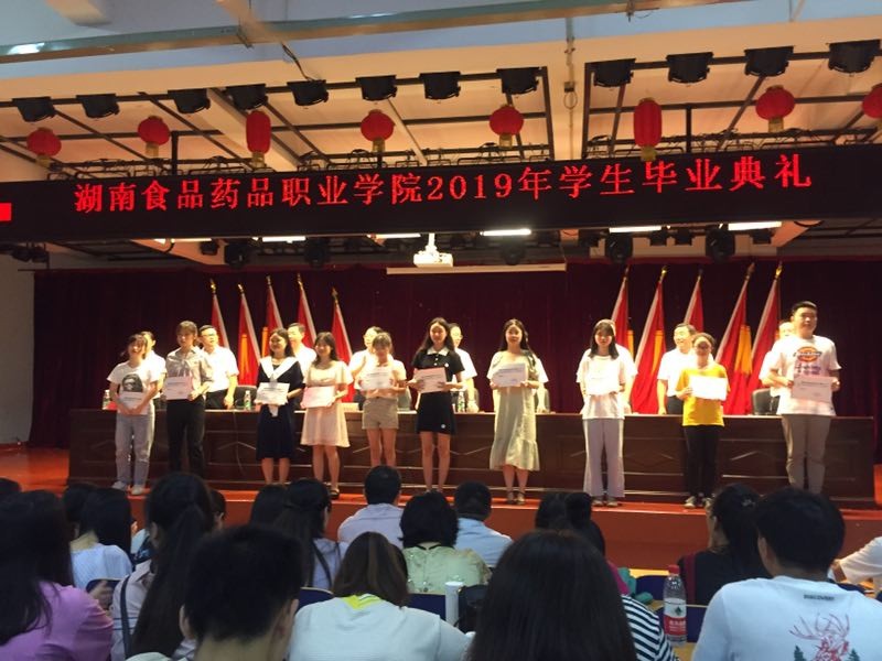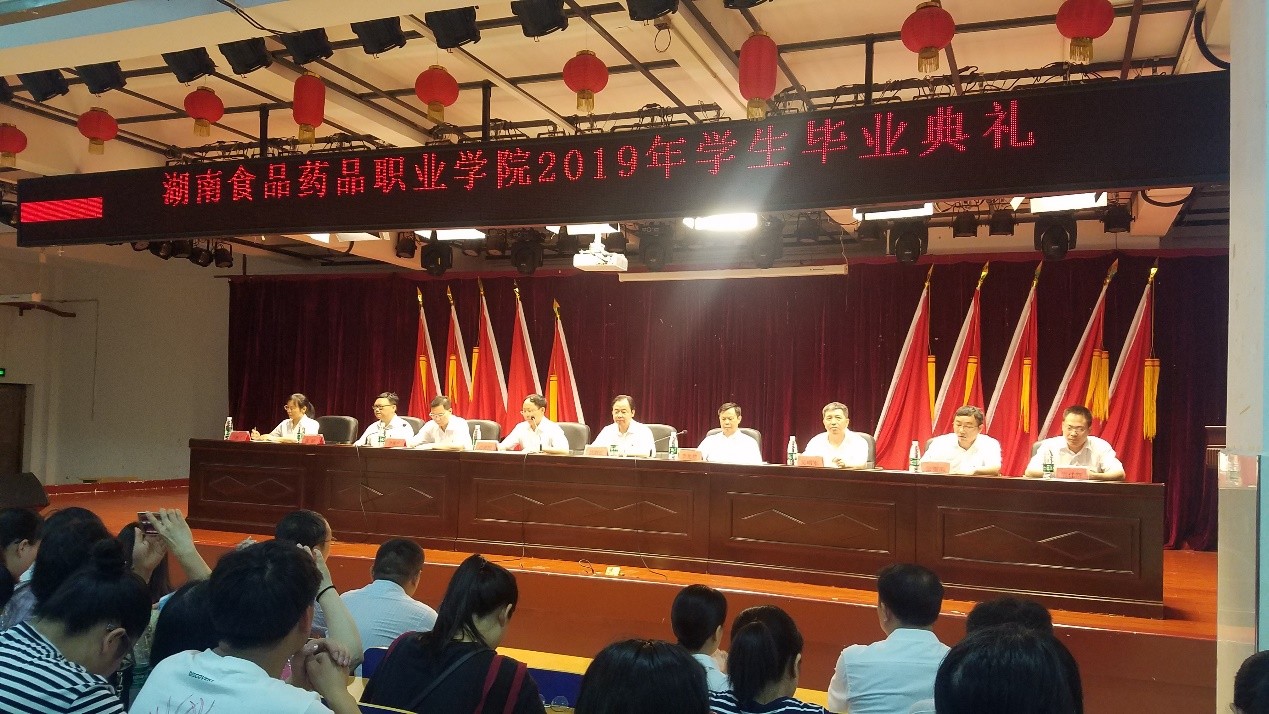 2019年6月22日上午9点,湖南食品药品职业学院2019年学生毕业典礼在食堂多功能一楼报告厅顺利举行。出席本次典礼的有:党委副书记、院长虢剑波,党委副书记、副院长李光锋,党委委员、副院长邓兴国,党委委员、副院长张雪昀,党委委员、副院长唐荣华,党委委员、纪委书记吴明军,党委委员 、宣传统战部部长欧健,党委委员 、组织人事处处长熊佳辉,副院级干部甘湘宁,教务处处长李时菊,学生工作与保卫处处长李建新,教师代表胡良惠,各二级学院院长、总支书记、学生干事、全体辅导员以及2019届毕业生代表。典礼由党委委员、副院长邓兴国主持召开。