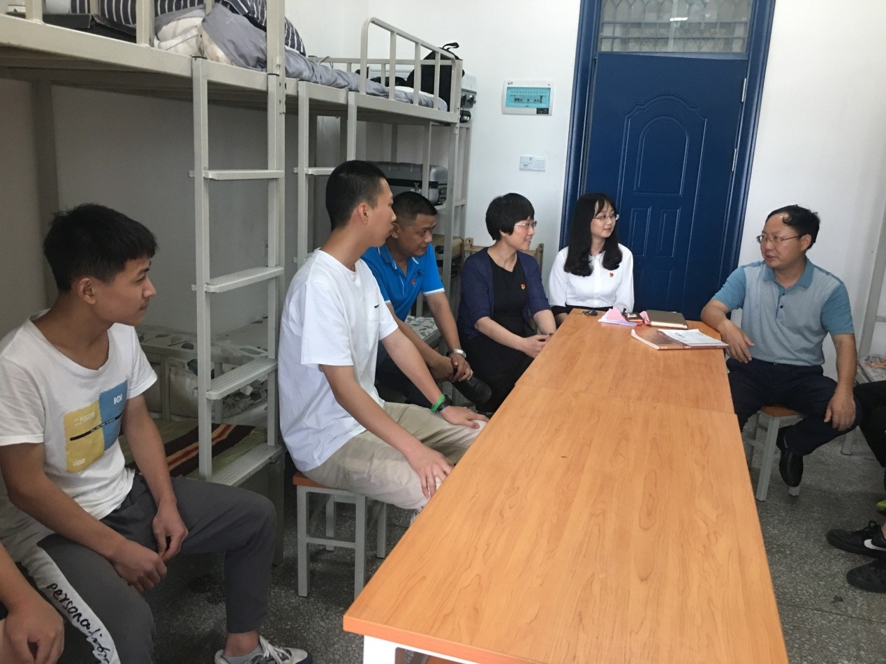 最后,邓兴国一行走进寝室,与同学们亲切交谈,学生们轻松互动,气氛活跃。他表示,寝室生活是校园生活的一个重要部分,是学生在学校的家,他希望同学们及时清理寝室垃圾,维持干净整洁的环境,营造温馨和谐的氛围,让寝室有阳光有温暖有爱。邓兴国结合实习生的事迹,要同学们养成良好的时间观念与规矩意识,并结合自己的学习和生活经历,希望同学们能吃苦耐劳,克服学习及生活中的难关。他要求要建立良好的师生关系,要老师经常深入基层了解学生的思想动态和合理诉求,及时解决学生的实际问题,做学生的坚强后盾。