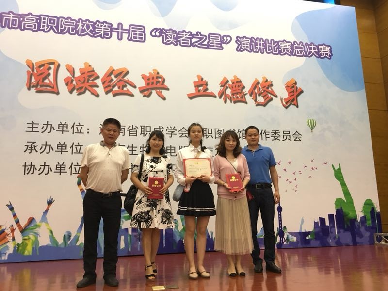 4月26日,在“世界读书日”到来之际,湖南省职成学会高职图书馆工作委员会举办了长沙市高职院校第十届"读者之星"演讲比赛,比赛在湖南生物机电职业技术学院知新楼进行。我校洞井学院选派的贺谦文同学参加了比赛,凭借稳定的发挥,出彩的演讲,荣获二等奖。廖楚珍和聂娜老师获得优秀指导老师奖。