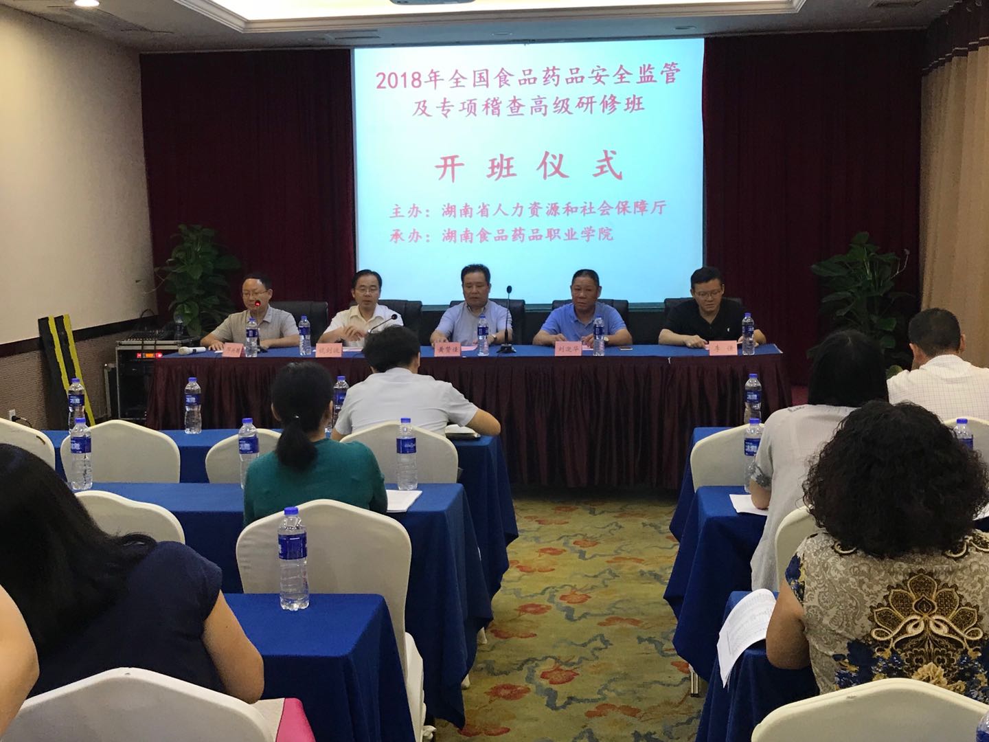 为了贯彻落实《人力资源和社会保障部办公厅关于印发专业技术人才知识更新工程2018年高级研修项目计划的通知》(人社厅发[2018]34号)和《湖南省人力资源和社会保障厅关于举办食品药品安全生产及专项稽查高级研修班的函》(湘人社函〔2018〕212号)精神,以高层次、急需紧缺和骨干专业技术人才为重点,进一步提高全国食品药品安全监管及专项稽查能力,“2018年食品药品安全监管及专项稽查高级研修班”于2018年9月17日在湖南长沙顺利开班,来自全国各省食品药品监管系统的高级管理人员共74人参加了培训。湖南省人力资源和社会保障厅副厅长黄赞佳、专业技术人员管理处副处长李谦、湖南省食品药品监督管理局副巡视员刘迎华、湖南食品药品职业学院院长虢剑波、副院长邓兴国出席了开班仪式。