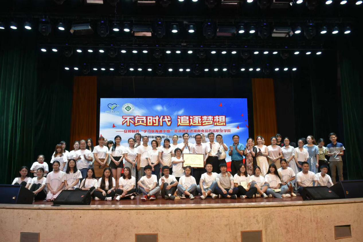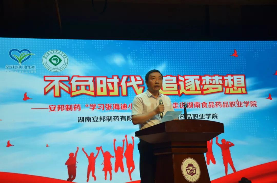 张雪昀副校长在致辞中指出,习近平总书记在党的十九大报告中提出的“深化产教融合、校企合作”要求,为当前职业教育改革发展指明了方向、明确了任务。湖南安邦制药有限公司作为校企深度合作的企业之一,不仅和学校联合建立科创中心、生产性实训基地,今天,还带着“大爱文化”和“学习张海迪小组”来校宣讲,更是校企合作育人的具体体现。他希望同学们向安邦“学习张海迪小组”的成员学习,坚定目标,自强不息,踏实学习,助人为乐,成就自我,服务社会。