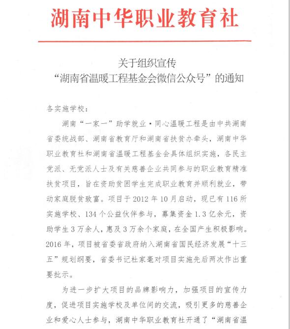 关于组织宣传“湖南省温暖工程基金会微信公众号”的通知
