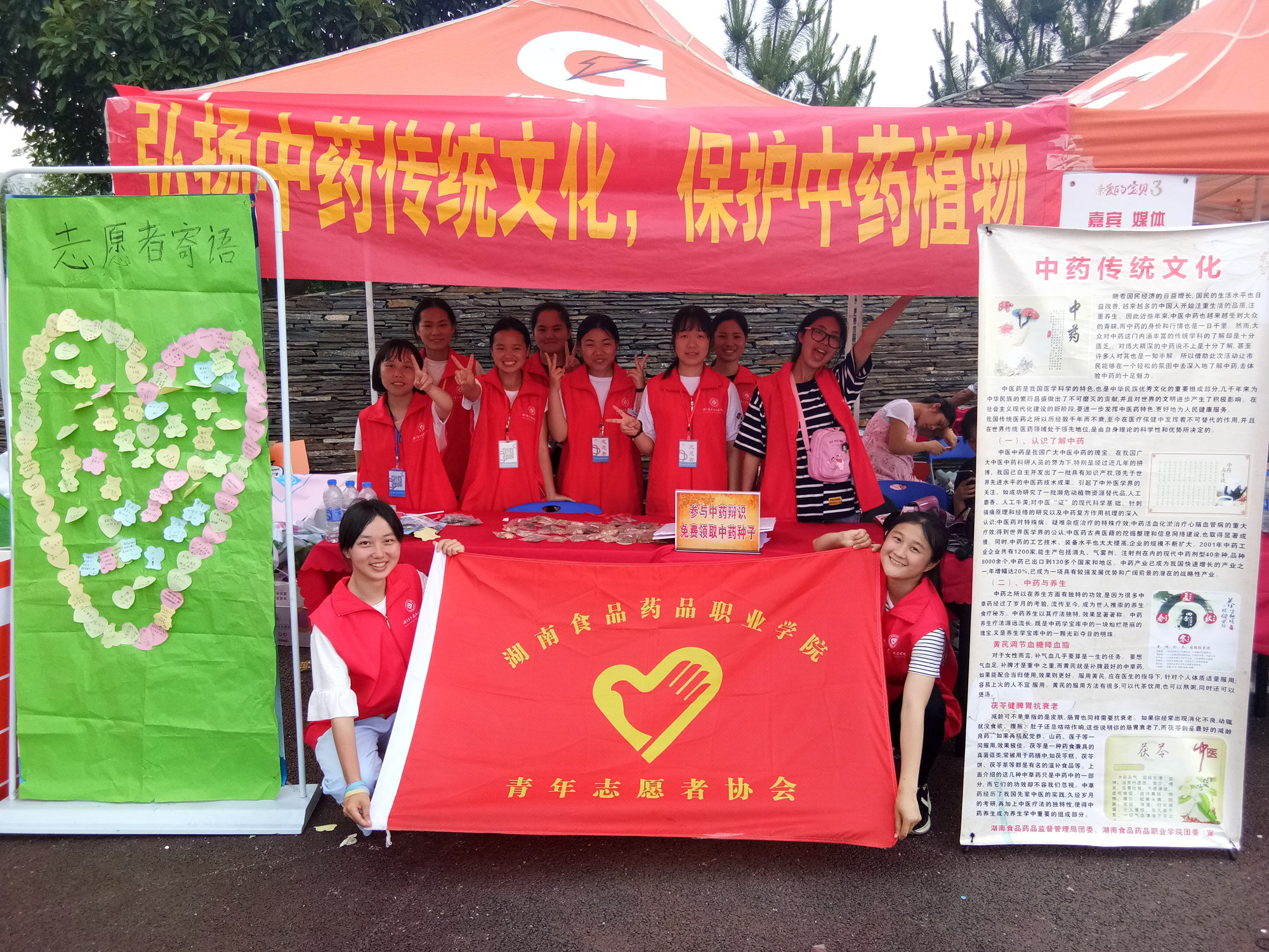 为了加强大家对中药文化的了解,激发对中药文化的热爱,传播中药知识,我校部分青年志愿者们于5月20日来到洋湖公园南门进行宣传。