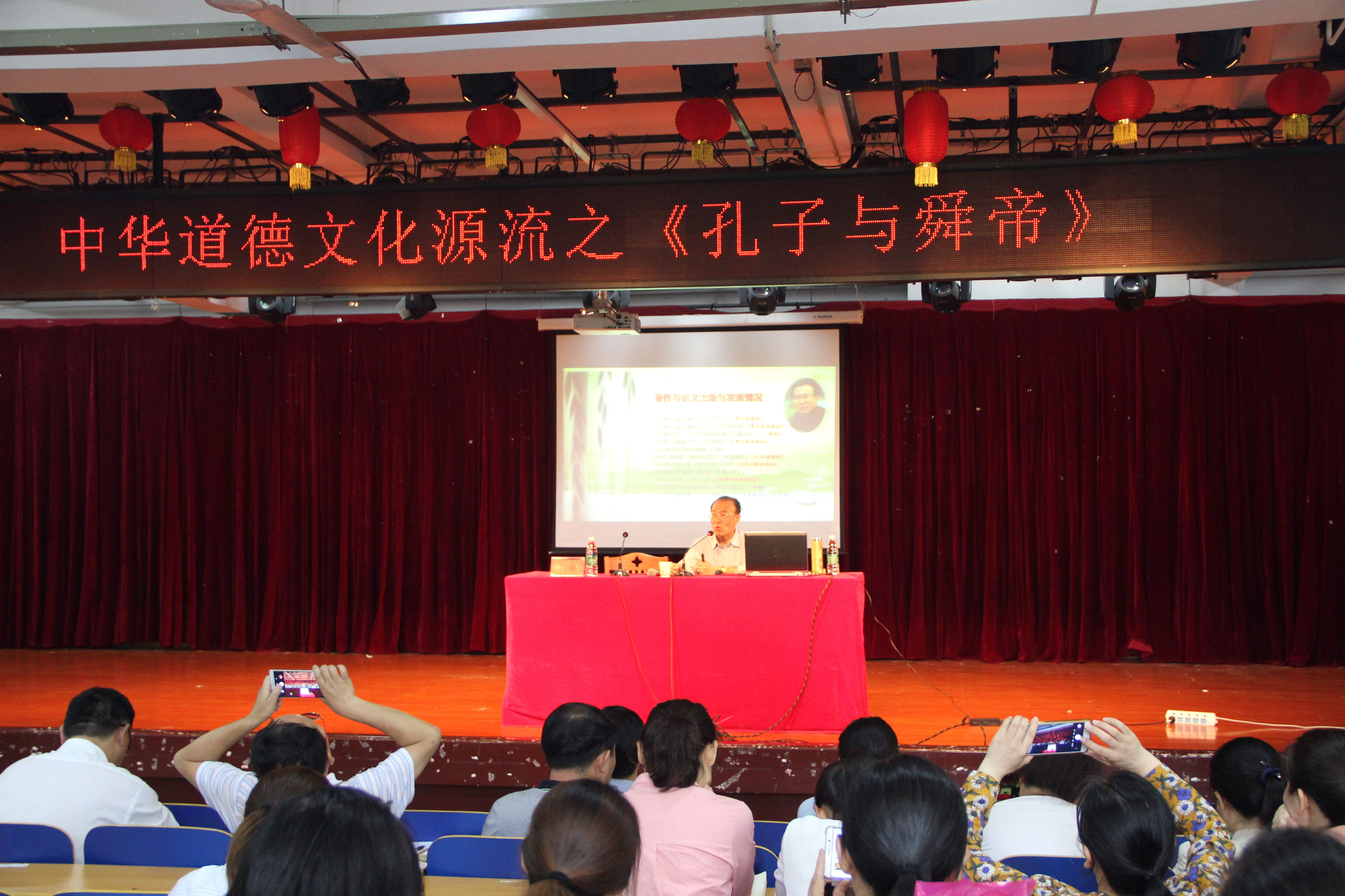 《孔子与舜帝》文化讲座主讲人郑国茂老先生是中华传统文化杰出传承人,从上个世纪80年代开始研究舜帝德孝文化和中华道德文化源流。郑老先生以《孔子与舜帝》为题,围绕舜文化“孝、德、和、福”的文化内涵,通过与孔子所创造的、以“仁”与“礼”为核心的儒文化的两相比较,得出舜文化是“慈”“孝”文化之源,“道德”文化之源,“和”文化之源,五福文化之源的结论。舜文化对于建设和谐家庭与和谐社会意义非凡。确立舜帝在中华民族优秀传统文化中的地位,在研究、弘扬、发展国学的进程中,才不至于数典忘祖,才能够做到增强文化自信。