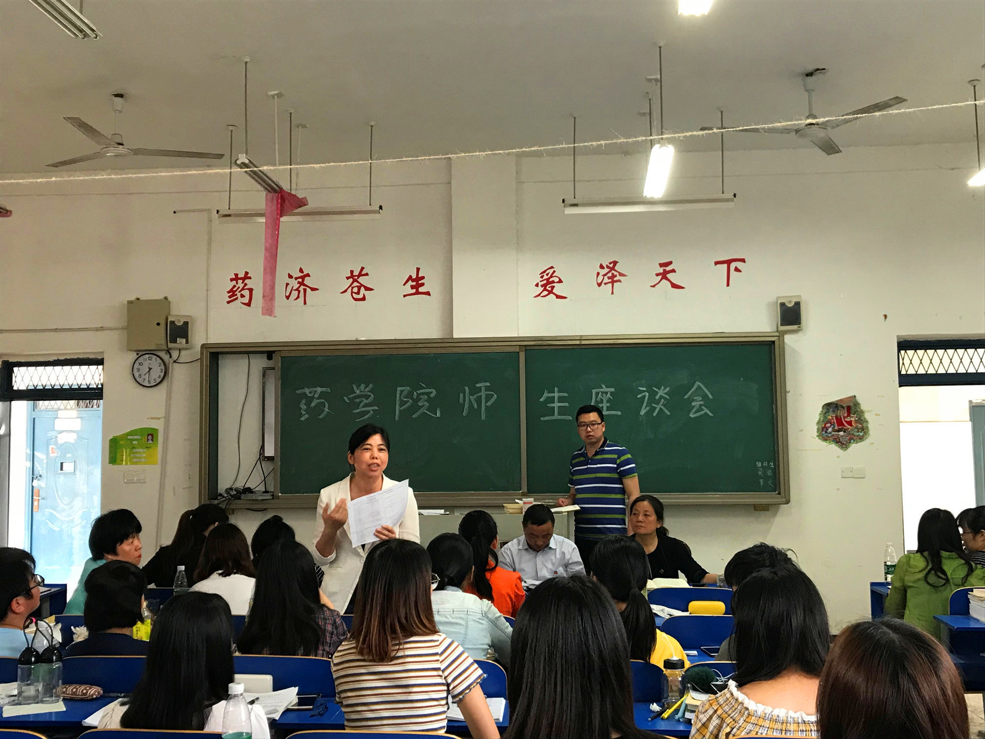 2018年5月8日下午15:00,药学院2018年上学期师生座谈会在教学楼412教室召开。本次座谈会由药学院党总支书记陈少华主持,学校党委委员、副校长张雪昀、药学院副院长周志涵、于勇,各教研室主任等教师代表及各班学生代表共计60余人参加了本次会议。
