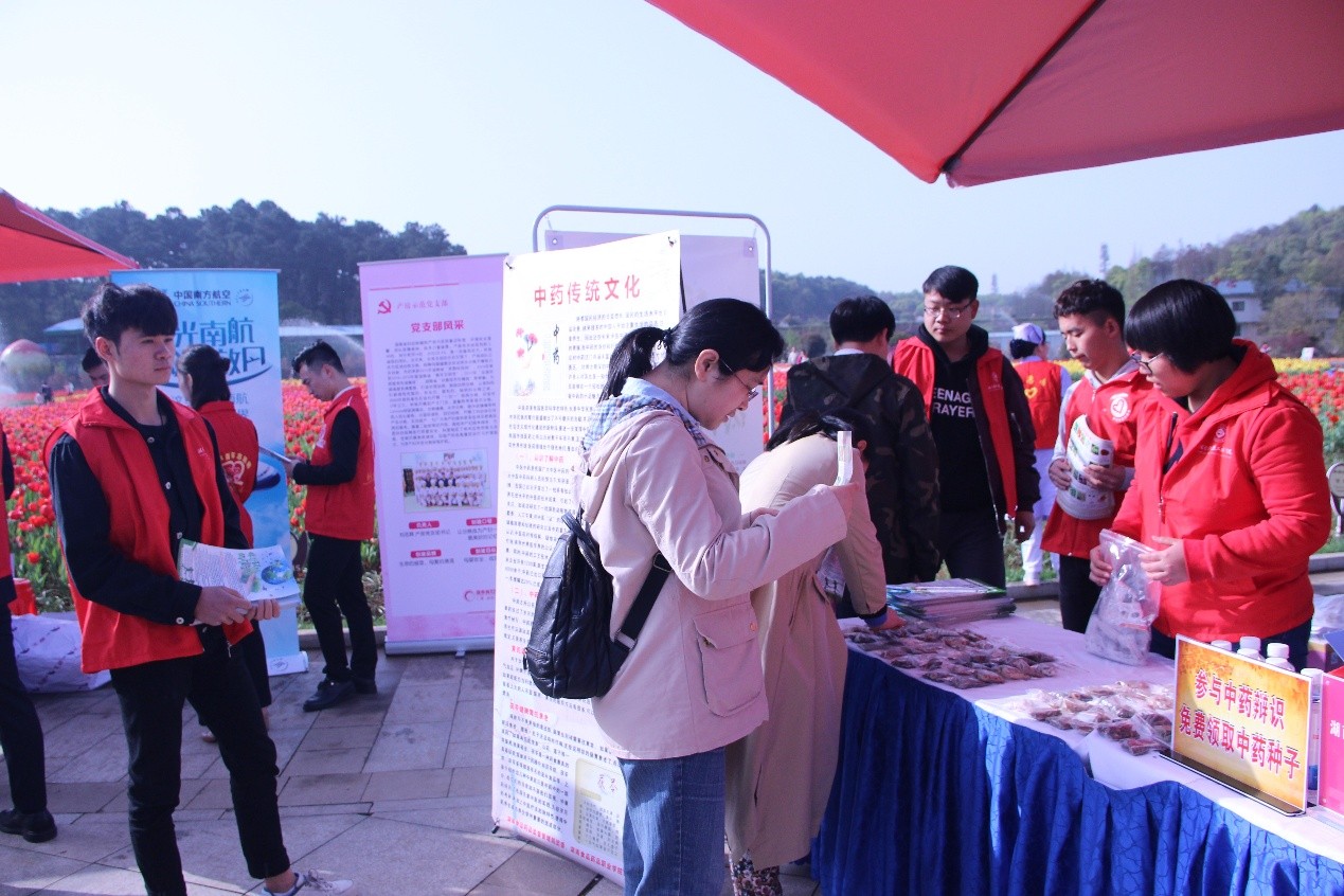 我校志愿服务队,围绕尊重自然、保护自然的主题,活动现场结合自身特色,设立中药展台普及中药知识,进行了辩药送中药种子的活动方式,向群众推广中药相关知识,并在现场向观众解答了常见中药认药小常识。
