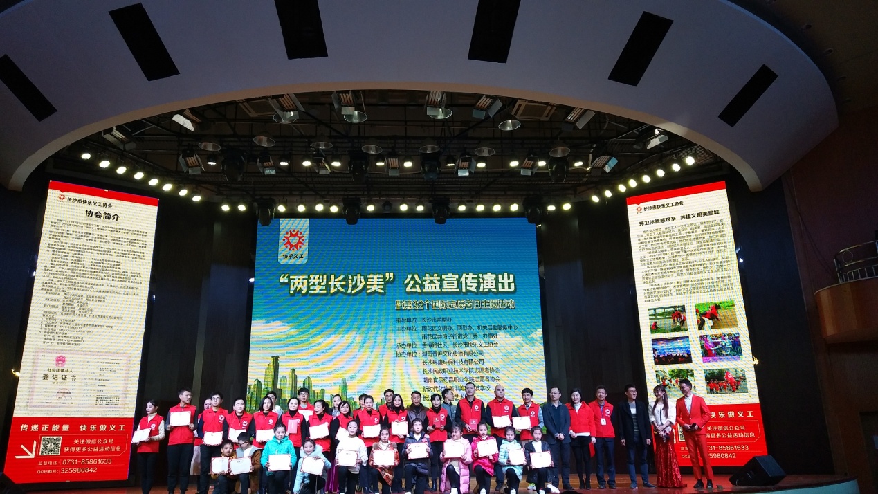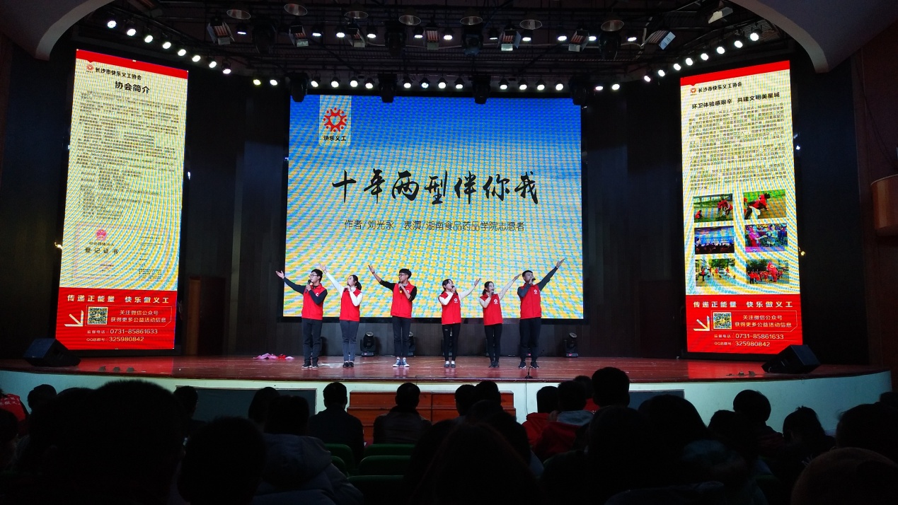 12月9日晚,长沙市快乐义工协会联合雨花区井湾子街道香樟路社区、长沙民政职业技术学院青年志愿者协会以及我校青年志愿者协会在长沙民政职业技术学院礼堂举办面向社区居民宣传两型知识的晚会。