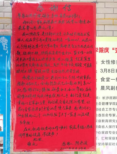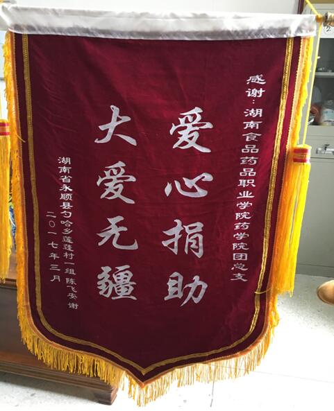 2017年3月7—8日,药学院在学生会、团总支的组织下,开展了为期两天的“手拉手”爱心募捐公益募捐活动,并将活动募集捐款4330 元捐给了湘西自治州贫困家庭陈钟小朋友。陈钟小朋友的家长向药学院学生会赠送了锦旗,还写了感谢信。