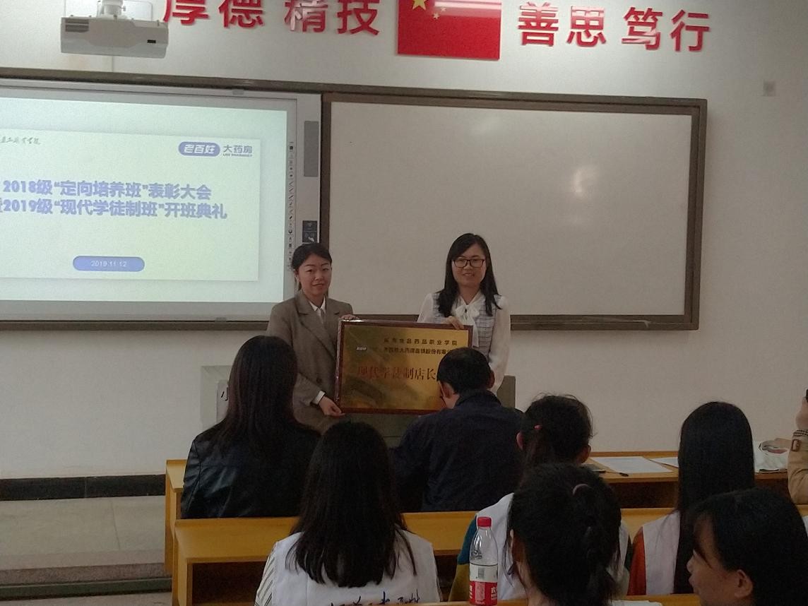 典礼上,首先由罗翀院长致欢迎辞,表达了对老百姓大药房各位领导和19级老百姓现代学徒制班同学的欢迎以及对18级订单班同学的肯定。然后由老百姓大药房湘北公司人力资源部谭海燕部长讲话并宣读表彰决定,谭海燕部长既对学院和老百姓公司在过往合作中取得的喜人成绩给予充分肯定,也对新一届老百姓现代学徒制班同学寄予了殷切期望。老百姓大药房连锁股份有限公司集团培训部黄灿经理和罗翀院长为获奖同学颁发获奖证书及奖学金。接下来,校企双方举行了签约和授牌仪式,对药品经营19303班授予了“现代学徒制店长1班”牌匾。最后,由谭海燕部长给19级老百姓现代学徒制班同学上了一堂生动有趣的企业文化课。