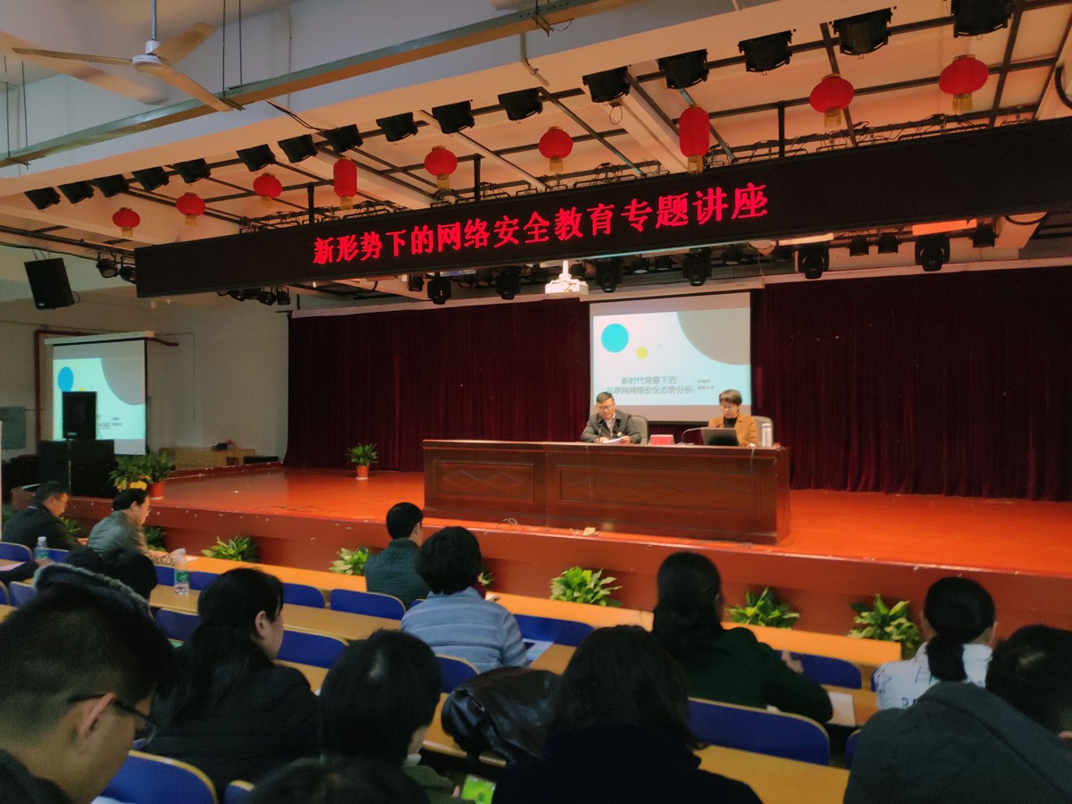 11月26日下午,我校在多功能报告厅举办了网络与信息安全专题讲座,特邀湖南大学息科学与工程学院孙建华教授担任主讲人。全校职工、学生代表聆听了讲座。党委委员、宣传统战部部长欧健主持讲座。