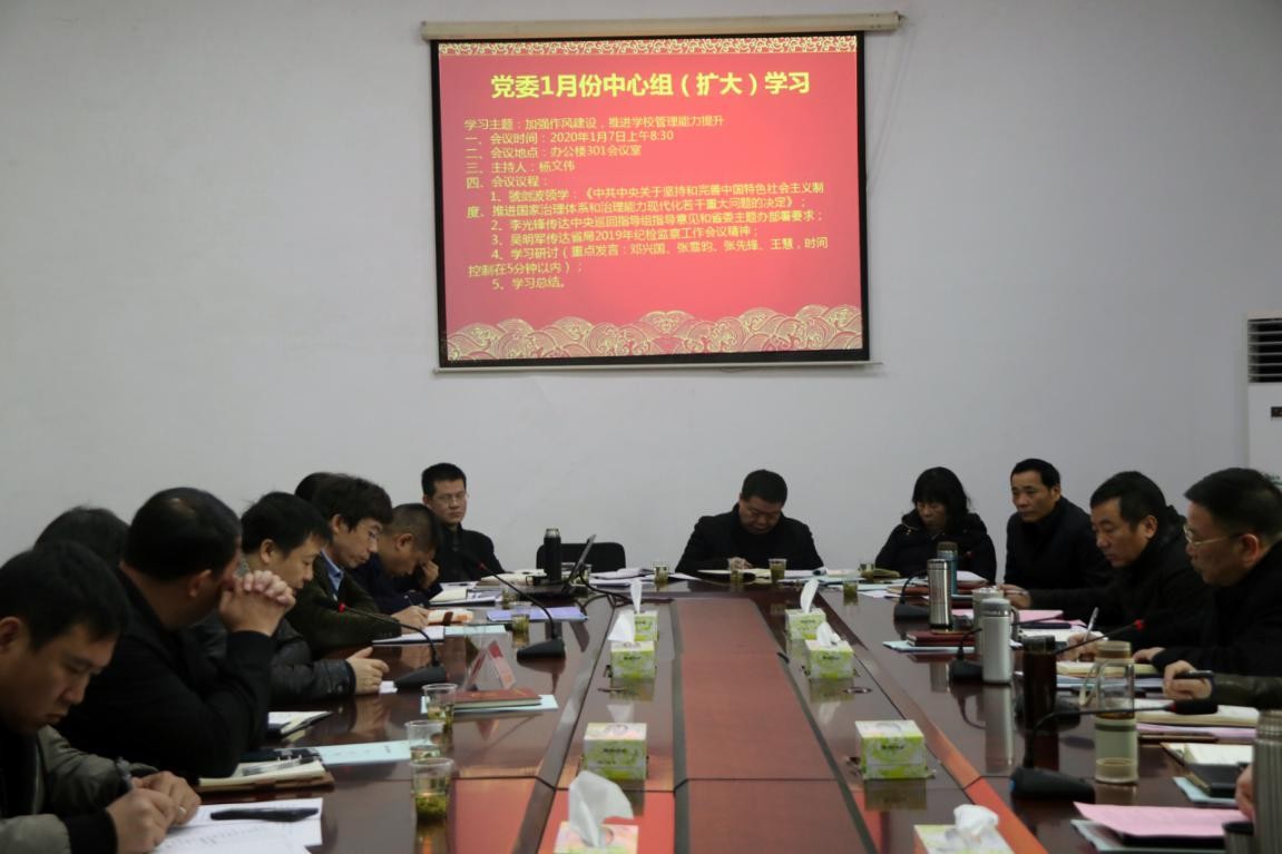 2020年1月5日,我校举行了主题为“加强作风建设,推进学校管理能力提升”的党委1月份中心组(扩大)学习。全体中层以上干部参加了集中学习。学校党委书记杨文伟主持会议。