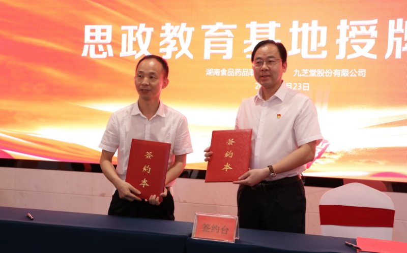 2020年6月23日,雨后初晴,带着炎炎夏日中的一抹清凉,在长沙市开福区芙蓉中路一段129号,湖南食品药品职业学院与“九芝堂中医馆”隆重举行“思政教育实践基地”授牌仪式。参加会议的有学校党委副书记、校长虢剑波、学校党委副书记、副校长李光锋以及九芝堂股份有限公司党委书记、总经理徐向平、九芝堂股份有限公司党委副书记、OTC事业部总经理雷衍飞。学校思政部全体思政教师,基础学院党总支全体党员参加活动。会议由九芝堂股份有限公司OTC事业部市场总监王妙军主持。