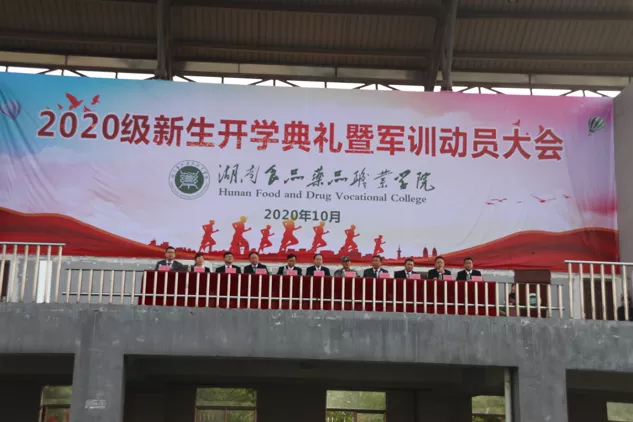 2020年10月12日,湖南食品药品职业学院2020届开学典礼在含浦校区体育场隆重举行。党委副书记、校长虢剑波,党委副书记、副校长李光锋,军训团团长刘坤,副校长张雪昀,纪委书记吴明军,组织人事处处长熊佳辉,宣传统战部部长欧健,副校级领导甘湘宁,学保处处长黄军华,教务处副处长于勇在主席台就坐。教官及全体新生参加了典礼。开学典礼由副校长邓兴国主持。