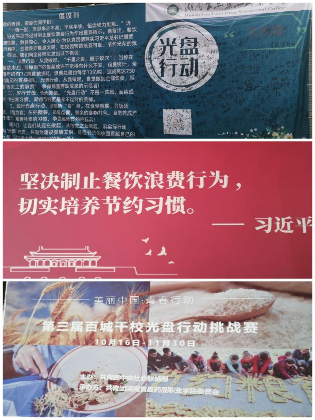 为认真贯彻落实习近平总书记坚决制止餐饮浪费行为,切实培养节约习惯的重要指示,同时推进我校文明校园建设,10月27日,共青团湖南食品药品职业学院委员会在食堂门口开展“光盘行动”公益倡导活动。