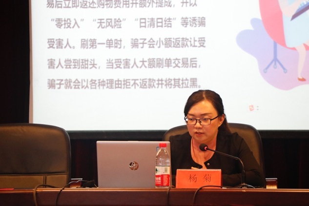 活动最后杨菊老师以“加强账户管理,防范电信诈骗”为主题,向同学们讲解了电信诈骗的相关内容,介绍了当前我国反电信诈骗形势,电信诈骗犯罪的手段、作案方式及作案特点,提醒同学们不要轻易将个人资料、银行卡号、存款密码等个人隐私信息告知他人。如遇到疑似诈骗事件要保持清醒,做到“三个不”,即不轻信、不转账、不泄密。