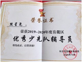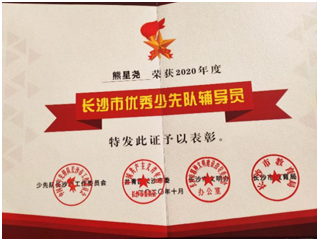 为认真学习贯彻习近平总书记关于第八次全国少代会的贺信和党中央致词精神,贯彻落实习近平总书记对良好效。因工作表现突出,我校教务第一党支部书记、校团委书记熊星尧荣获“长沙市优秀少先队辅导员及“岳麓区优秀少先队辅导员”荣誉称号。