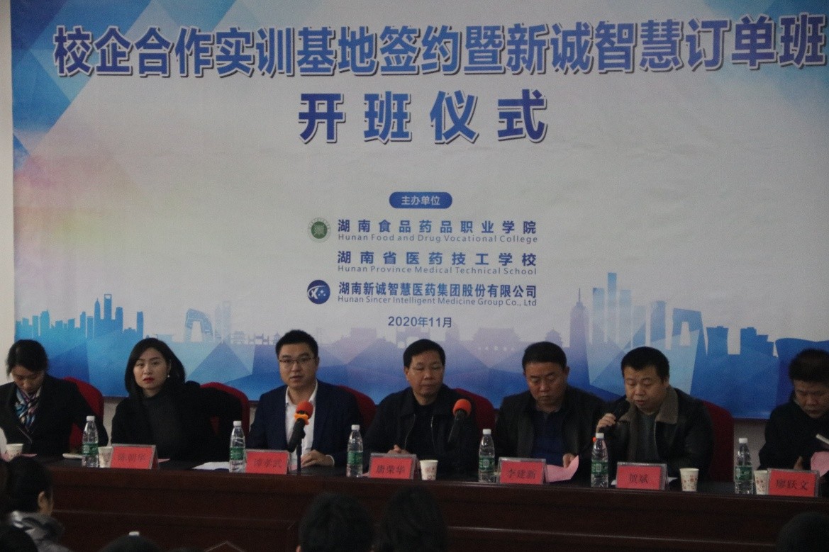 2020年11月26日,由湖南省医药技工学校与湖南新诚智慧医药集团有限公司共同举办的“校企合作实训基地签约暨新诚智慧订单班开班仪式”在洞井校区顺利召开。出席此次签约仪式的嘉宾有湖南新诚智慧医药集团有限公司总经理谭孝武及公司相关负责人,学校出席此次会议的有党委委员、副校长唐荣华、招生就业处处长李建新及洞井学院班子成员,新诚智慧订单班班主任、辅导员及全体学生参加了此次仪式。