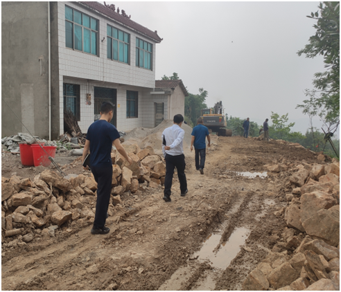 图4-驻村工作队与村两委一同查看损毁道路施工现场