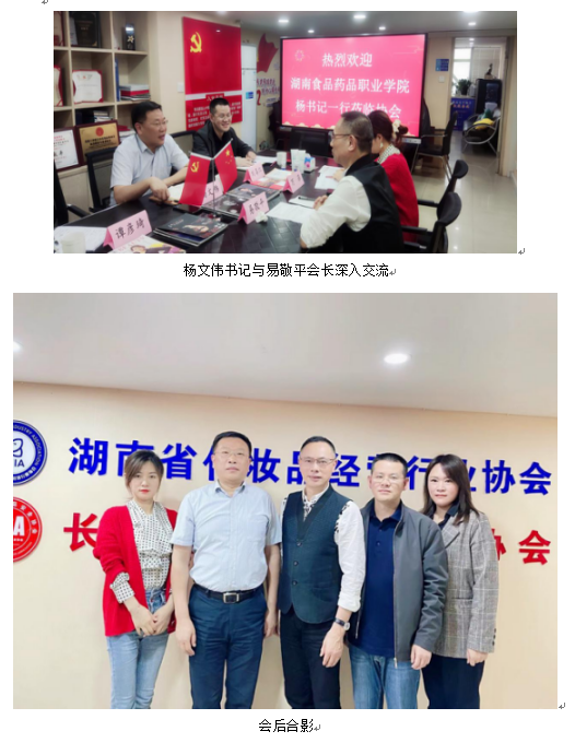 2021年5月19日,我校党委书记杨文伟率领经管学院院长刘喜红、经管学院二支部书记谭彦琦前往湖南省化妆品经营行业协会,与协会会长易敬平先生就深化产教融合、探索双方合作开展研讨座谈。