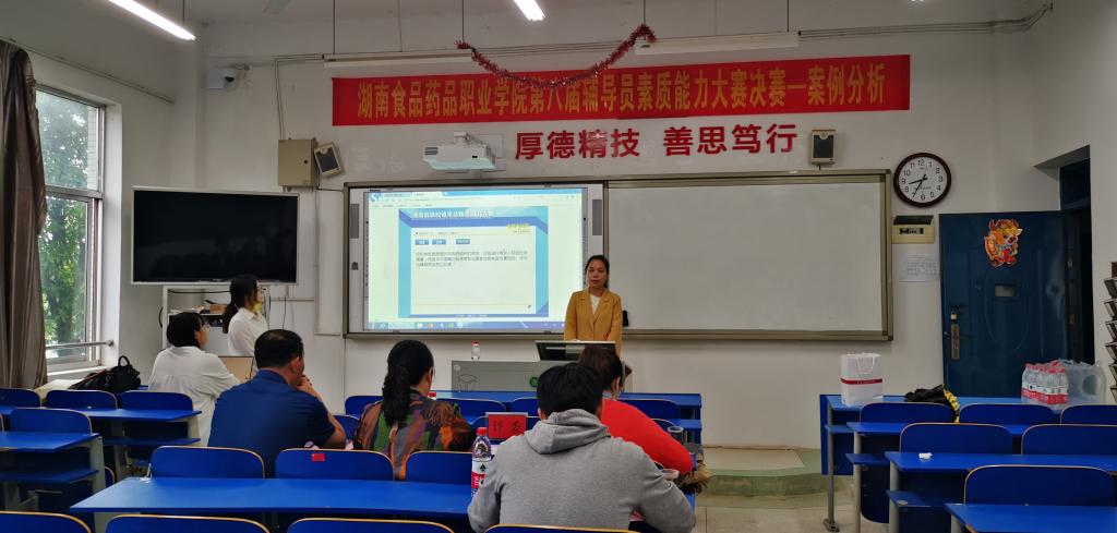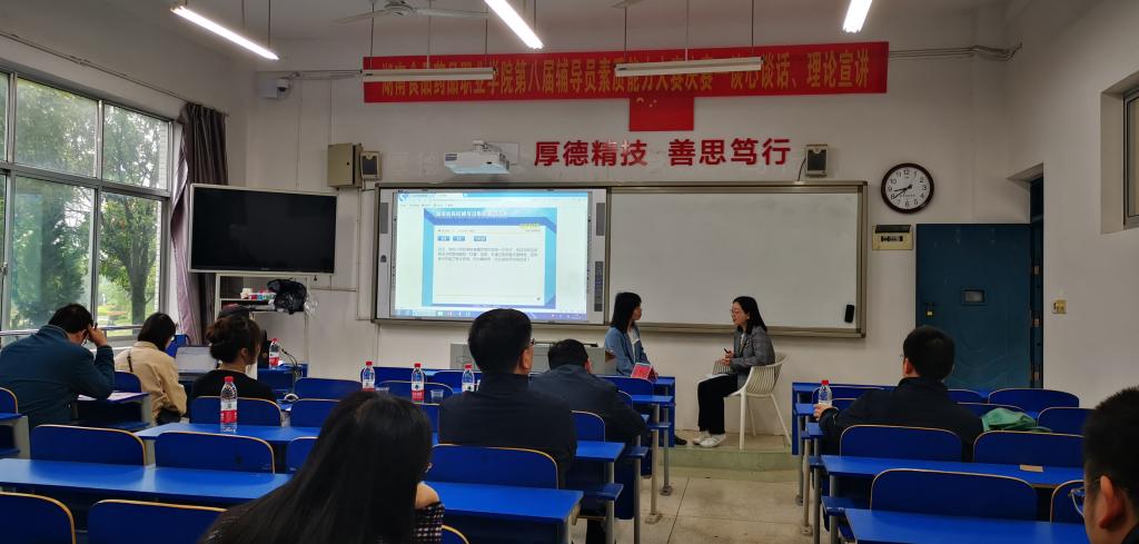 本次大赛分为初赛和决赛两个阶段,共有21名辅导员参加了理论测试、班情熟知两个环节的初赛,重点考察辅导员的理论素养和业务知识及辅导员对所带学生基本情况的熟悉程度。前10名成绩辅导员参加了案例分析、理论宣讲和谈心谈话三个环节的决赛。决赛各环节再现了日常学生工作中经常遇到的大学生学业、就业、情感、心理健康、学生干部培养、校园贷款、网络思政教育等大学生思想政治教育的热点、难点等多方面的问题,全面考察了在规定的时间内条理清晰地提出问题所在、解决问题的思路、实施办法及化解思想困惑和心理矛盾等能力,赛场上呈现了辅导员日常工作状态和老师们的基本功及职业素养。