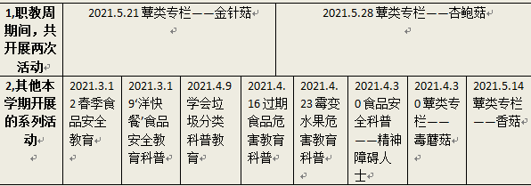 为响应2021年湖南省职业教育活动周的号召,积极宣传职业教育支撑经济社会发展、服务美好生活的典型事迹,宣传职业院校服务“一带一部”技术技能人才建设,服务湖南“三高四新”战略,助力湖南制造、中国制造走向世界等方面的典型实践。校团委多次开展了“食安小卫士”系列项目活动,达到了服务社会、服务技能人才建设的效果。