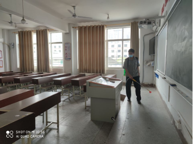 学生教学区演练。综合办在教学楼大门门设置安全距离指示标志,使学生进出公共区域养成保持1米间距的习惯。演练过程中,一位班主任在教室门口进行晨检,发现一位体温异常学生,立即向应急处理小组负责人通电话汇报情况,并且将该生和与其相关的人员带离教学区,前往隔离室等待医护人员将其送往医院做核酸检测。
