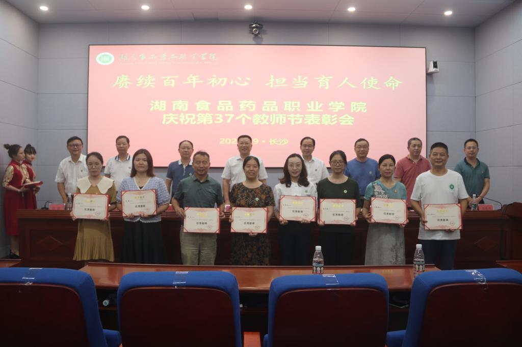 党委委员、副校长邓兴国宣读《湖南食品药品职业学院关于表彰第三届“教学名师”及2020-2021学年优秀教师、优秀教育工作者的决定》。学校药学院院长万能、食品学院副院长徐魏、中药学院副教授蒋桃获得第三届“教学名师”荣誉称号,王萍等29名教师获得“优秀教师”荣誉称号,尹黎莉等9名教师获得“优秀教育工作者”荣誉称号。学校领导为获得以上荣誉的教师颁奖,并勉励大家珍惜荣誉,再接再厉,发挥模范作用,再创新的业绩。