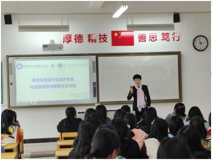 签约仪式后,易敬平、张景菊等人走进课堂向2021级化妆品经营与管理专业学生介绍了该行业的发展历程、发展现状以及发展前景,帮助同学们进一步树立了对今后步入化妆品行业的信心。