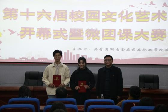 (基础学院院长舒展老师和学生工作与保卫处副处长戴维老师为荣获优胜奖选手颁奖)