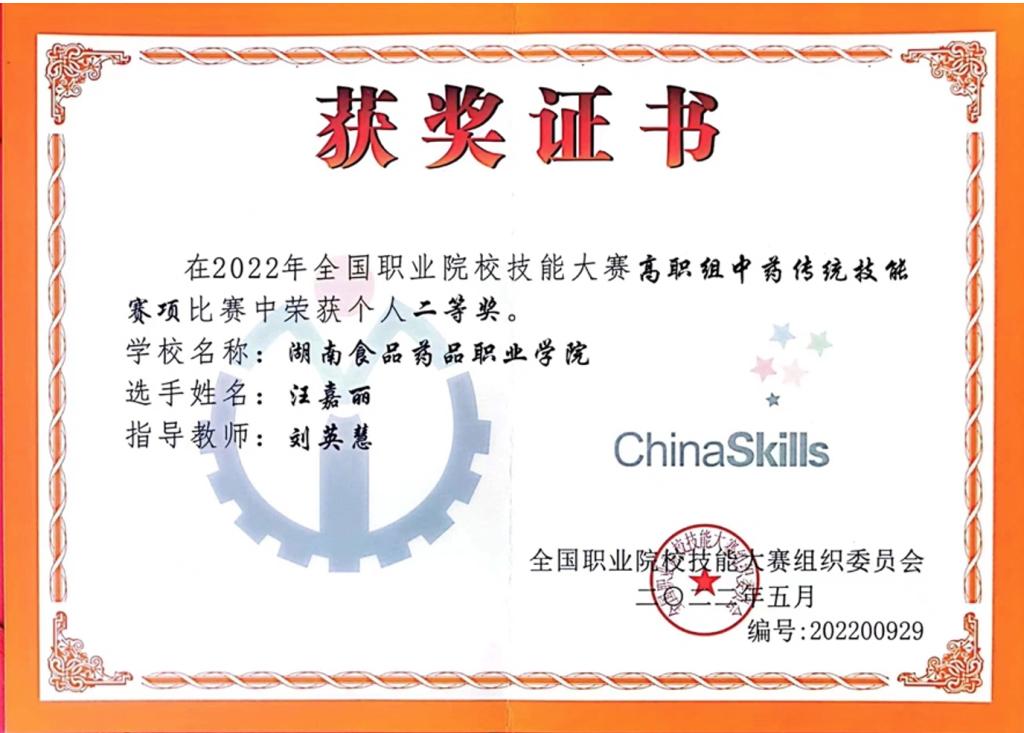 大赛点亮人生,技能改变命运。7月30日,2022年全国职业院校技能大赛中药传统技能赛项在重庆三峡医药高等专科学校圆满落下帷幕,我校中药学院参赛选手汪嘉丽同学凭借扎实的专业技能和过硬的心理素质,经过三天鏖战,最终以全国排名第六的成绩荣获二等奖。