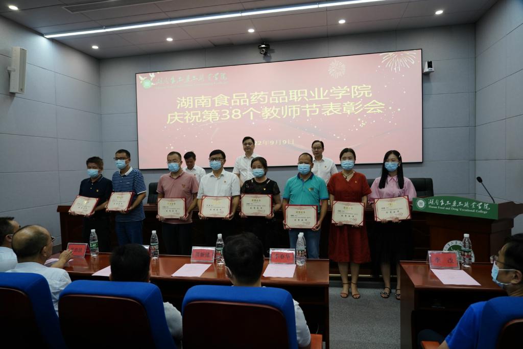 李光锋宣读了湖南食品药品职业学院关于2021-2022学年优秀教师、优秀教育工作者的决定。万能等30名教师获得“优秀教师”荣誉称号,王小莉等8名教师获得“优秀教育工作者”荣誉称号。与会领导为获得以上荣誉的教师代表颁奖,并勉励大家珍惜荣誉,再接再厉,发挥模范作用,再创新的业绩。