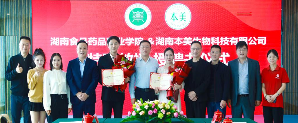 2023年10月8日上午,在湖南省化妆品经营行业协会的推动下,湖南食品药品职业学院与湖南本美生物科技有限公司特聘教授授聘书仪式在本美集团举行。