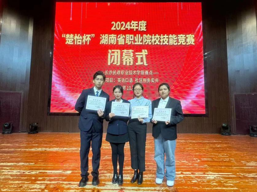 11月26日,2024年度“楚怡杯”湖南省职业院校技能竞赛“英语口语”赛项在长沙民政职业技术学院圆满落幕。经过激烈角逐,我校彭静如老师与李元昊同学、蒋露露老师与刘君同学在竞赛项中均荣获三等奖。