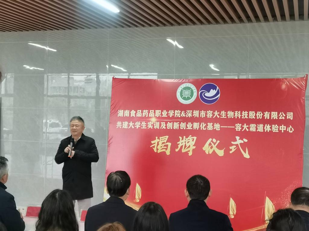 2024年3月18日,我校与深圳市容大生物科技股份有限公司在3号实验楼举行校企共建大学生实训及创新创业孵化基地暨“容大霜道体验中心”揭牌仪式。深圳市容大生物科技股份有限公司董事长韩敏、深圳市青春纳斯健康科技有限公司总经理陈琼星、容大生物湖南市场总经理谢玮及企业相关负责人,学校党委副书记、校长虢剑波,副校长邓兴国,学校相关负责人及师生代表出席仪式。