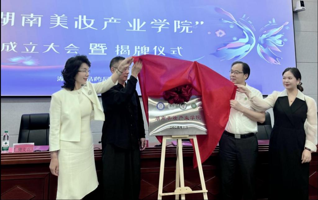 虢剑波、易敬平、霍江艳、樊文花共同为“湖南美妆产业学院”的建设揭牌。虢剑波还向首届美妆产业学院理事会理事长、副理事长、产业学院院长、副院长颁发聘书。