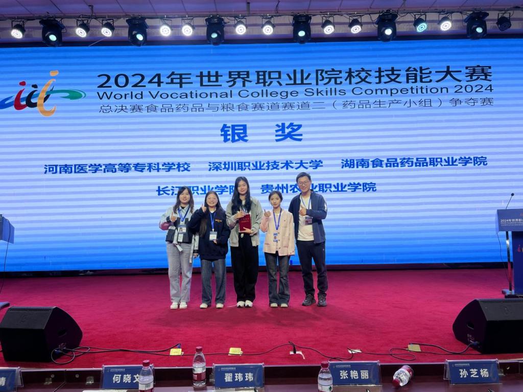 10月25日-29日,2024年世界职业院校技能大赛总决赛食品药品与粮食赛道二(药品生产小组)争夺赛在江苏食品药品职业学院举行。经过连续数日的激烈角逐,我校药学院张云坤、李佳俐老师指导的肖丹、郑银、孙梓桐团队,在全国50支顶尖代表队中脱颖而出,以总分全国第七的优异成绩斩获银奖。