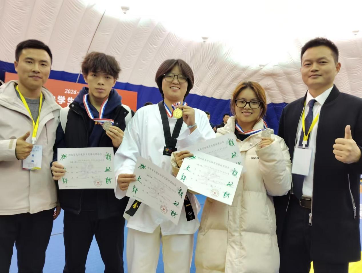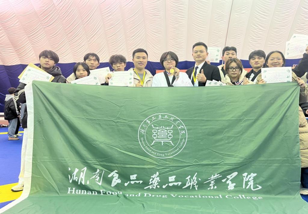 2024年12月1日-6日,我校跆拳道代表队参加了2024年湖南省大中学生跆拳道比赛。丁易、田达老师指导的药质2302班学生阳伟乐获得女子+73公斤级金牌,实现我校在湖南省大中学生运动会上的金牌突破;药管2302班学生余立志获得男子68公斤银牌、个人品势第6名、团体品势第6名;中药2407班学生房丹获得女子67公斤铜牌、团体品势第6名;药学2308班学生木色毛龙获得男子63公斤第5名、团体品势第6名;药剂2303班学生周鑫获得男子58公斤第5名;中制2201班学生刘琳琳获得团体品势第6名;药学2301班学生邹翔获得团体品势第6名;药剂2401班学生刘妍获得团体品势第6名。