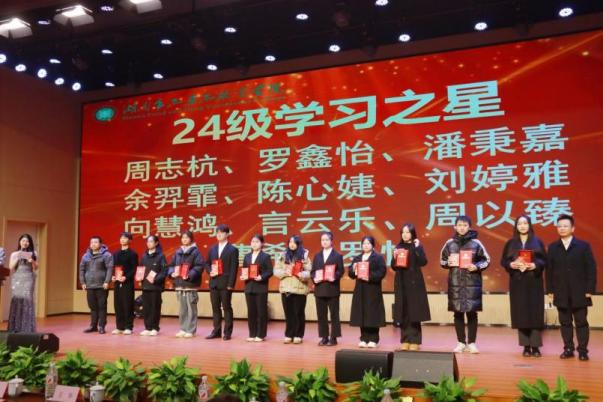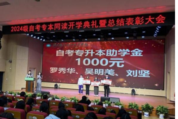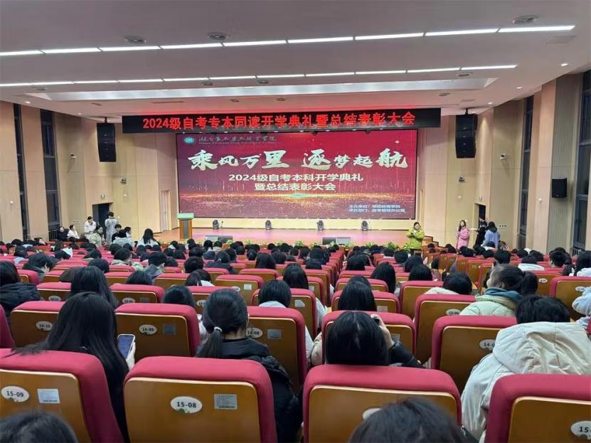 12月12日继续教育学院在新实验楼多功能厅召开了以“乘风万里,逐梦启航”为主题的24级自考专本同读班开学典礼暨总结表彰大会。此次大会不仅是对过去一学年学校自考助学教育教学成果的总结与回顾,更是为广大学员树立榜样、激励斗志,为新的学习征程吹响了号角。