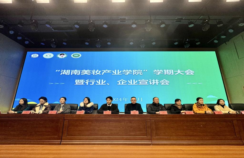 12月24日下午,“湖南美妆产业学院”学期大会暨行业、企业宣讲会在学校报告厅隆重召开。湖南省化妆品经营行业协会会长易敬平、湖南本美生物科技有限公司执行总裁晏锋、樊文花集团湖南分公司总经理赵海燕、蕾琳国际人力资源部总监廖佳、学院副校长邓兴国、校级领导甘湘宁、经管学院班子成员、妆管专业老师及23级24级化妆品经营与管理专业全体学生出席,会议由经管学院院长刘喜红主持。