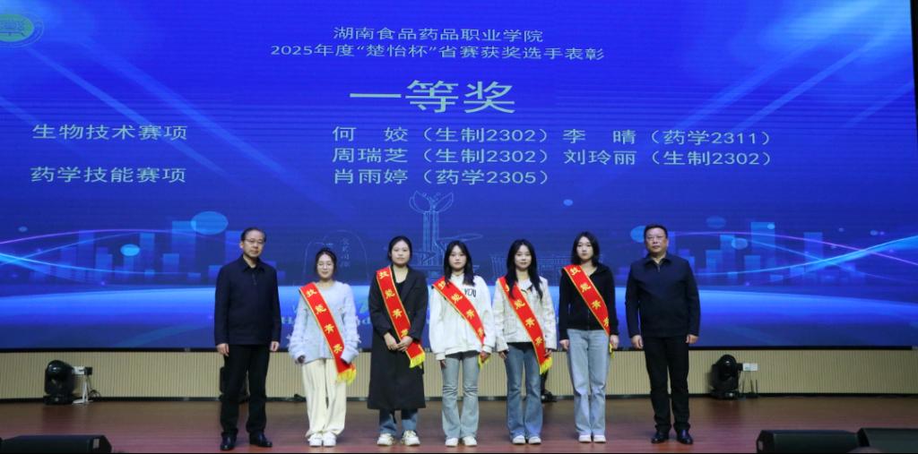 活动伊始,进入激动人心的颁奖环节。在激昂的音乐声中,主持人依次宣读2025年度“楚怡杯”省赛获奖学生名单。学校领导为获奖选手颁发荣誉证书与奖杯。