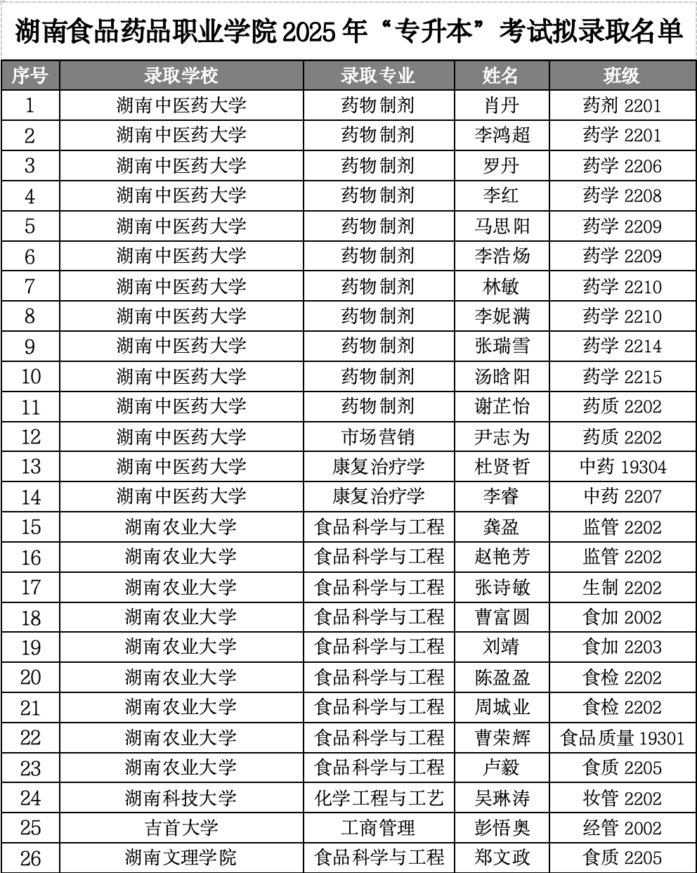 近日,湖南省2025年专升本考试录取结果公布,我校学子取得优异成绩。148名学子成功获得本科院校拟录取资格,录取院校包括湖南中医药大学、湖南中医药大学湘杏学院、长沙医学院、湖南医药学院等。