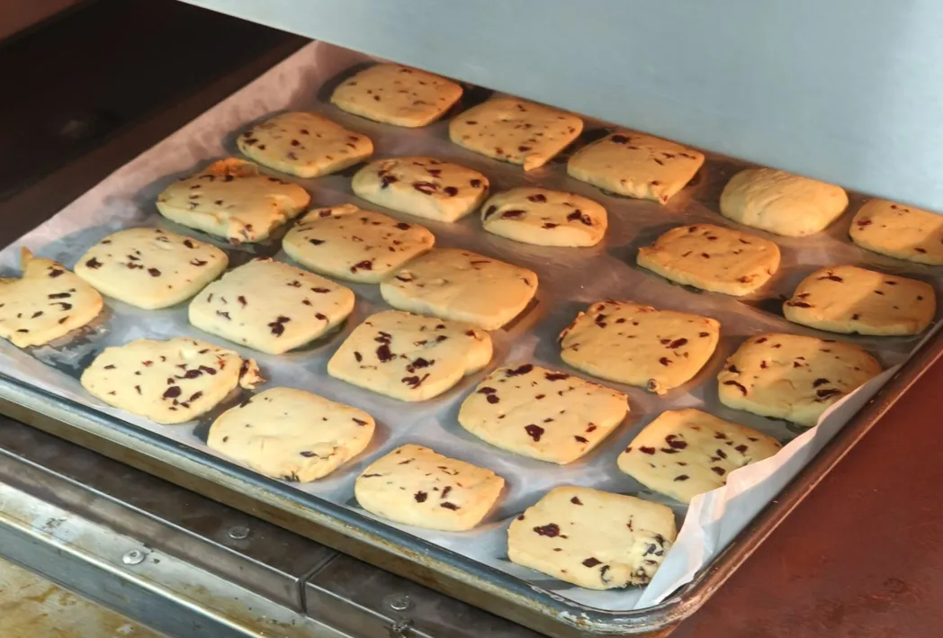 “叮——”烤箱提示音响起,金黄酥脆的曲奇列队出炉,浓郁香气瞬间包裹整个活动室。同学们戴起隔热手套取出烤盘,迫不及待尝一口,黄油的醇厚与糖粉的清甜在口中散开,“比买的还好吃!”惊喜赞叹声不断。大家举着印着小爱心、“食光”字样的曲奇合影,笑容里满是成就感。
