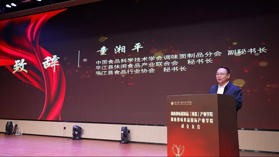 中国食品科学技术学会调味面制品分会副秘书长、平江县休闲食品产业联合会秘书长、平江县食品行业协会秘书长童湘平指出,平江辣条已具备坚实的产业基础和良好的国际声誉,智能工厂的普及更标志着行业进入“智造时代”。产业学院的成立将进一步打通“标准制定-人才培养-技术转化”的闭环,助力行业破解标准化、健康化发展难题,增强全球市场核心竞争力。
