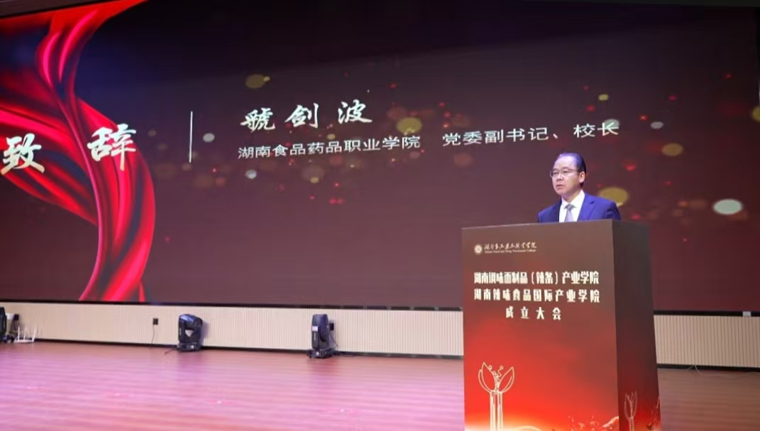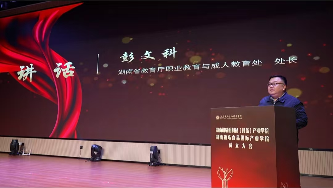 湖南省教育厅职业教育与成人教育处处长彭文科表示,湖南辣味食品国际产业学院、湖南调味面制品(辣条)产业学院正式揭牌成立。这是我省职业教育深化产教融合、服务地方产业、践行随企出海的一件盛事,也是推动职业教育适应性发展,增强服务湖南现代化产业体系能力的重要举措。希望各成员单位立足国家战略,深化校企协同,产业学院的成立,是新征程的起点。希望湖南食品药品职业学院能以此次揭牌为契机,牢牢把握高质量发展这个首要任务,大胆探索,锐意创新,与行业企业通力合作,将产业学院建设成为湖南职业教育的“金名片”和地方特色产业发展的“加速器”,为奋力谱写中国式现代化湖南篇章作出新的、更大的贡献!