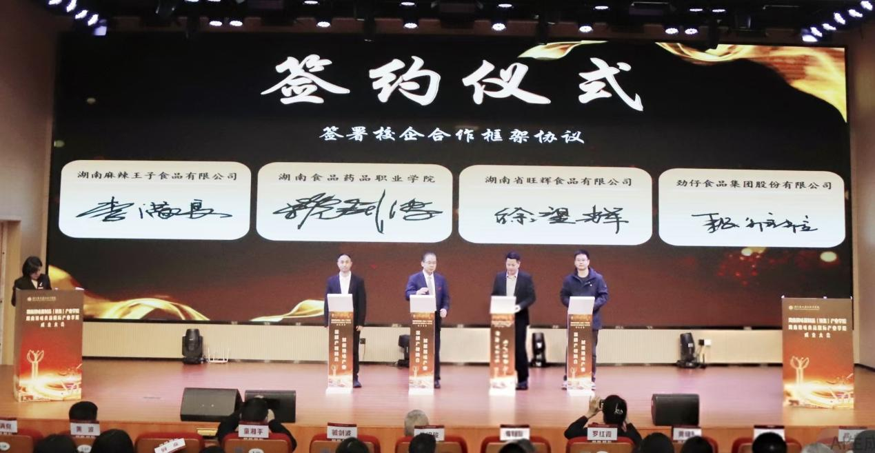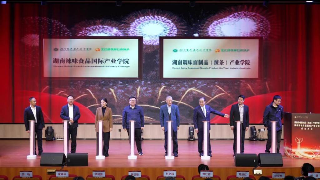 2025年11月8日,湖南辣味零食国际产业学院、湖南调味面制品(辣条)产业学院揭牌仪式在我校隆重举行。两大产业学院由我校和平江县食品行业协会牵头,联合劲仔食品集团股份有限公司、湖南麻辣王子食品有限公司、湖南省旺辉食品有限公司等头部企业共同组建,依托学院食品专业优势,践行国家职教出海战略,标志着湖南辣味食品产业在“政校企协同、产学研融合、国际化布局”道路上迈出关键一步,为千亿级产业全球升级注入强劲动能。